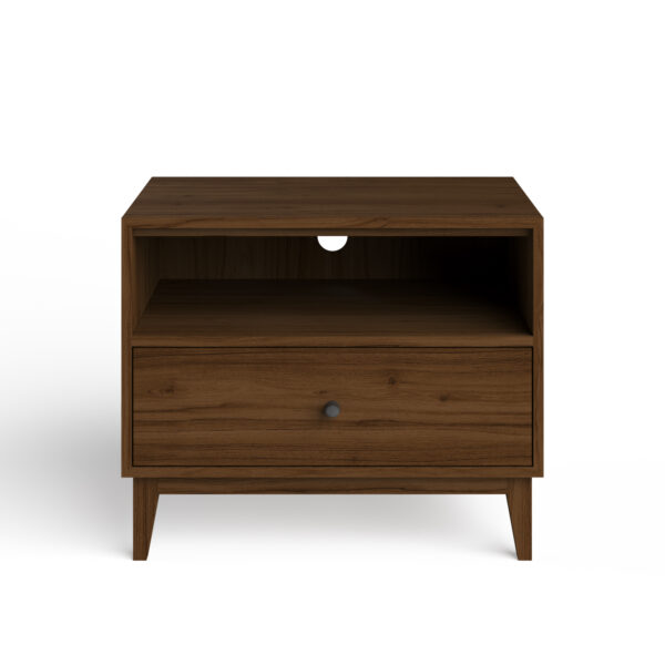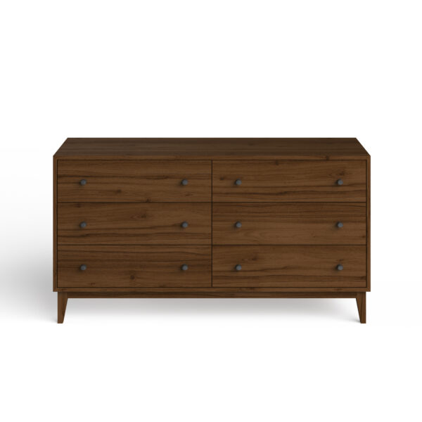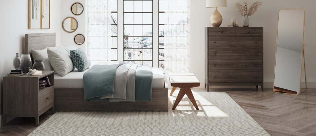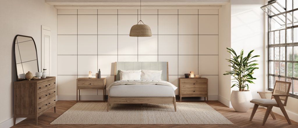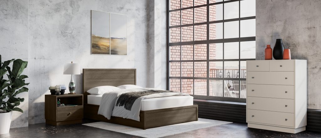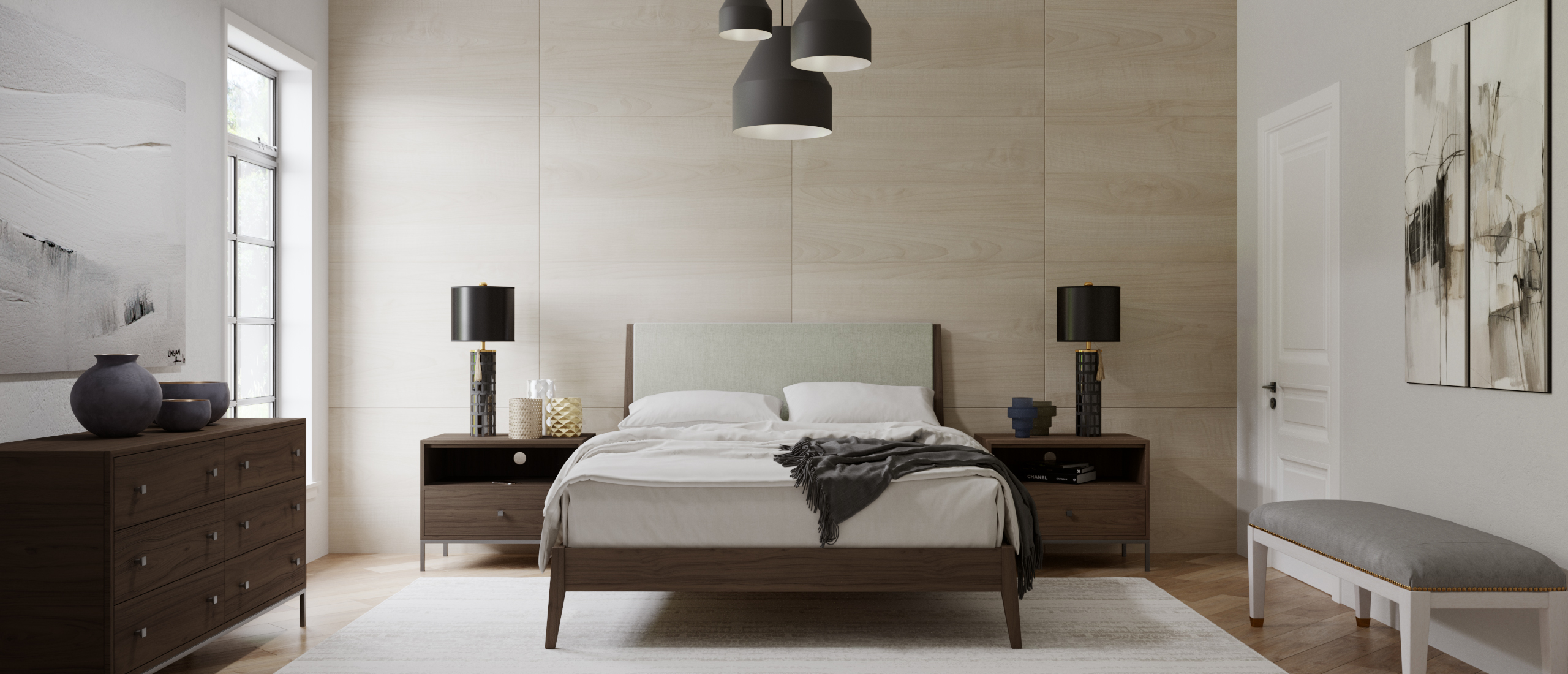 The G08 Bed with plain upholstered inset pairs beautifully with the Downsview nightstands in 30″ width, all in warm walnut veneers and solids. Add channelled upholstery for additional softness and texture, combine open and closed storage options, two tone the large dresser or play with mixed metals by using different hardware. Each piece can be made unique!
