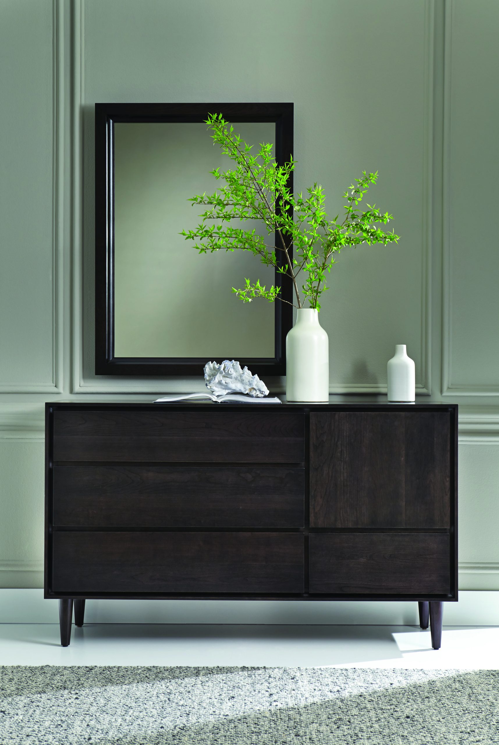The Camber Collection in solid cherry features beds in Queen and King with either wood slat or one upholstered panel, euro or panel footboards and integrated wood handles on the case pieces. Open or closed nightstand options and door, drawer or lingerie style storage pieces. Standard finishes are umber or graphite.