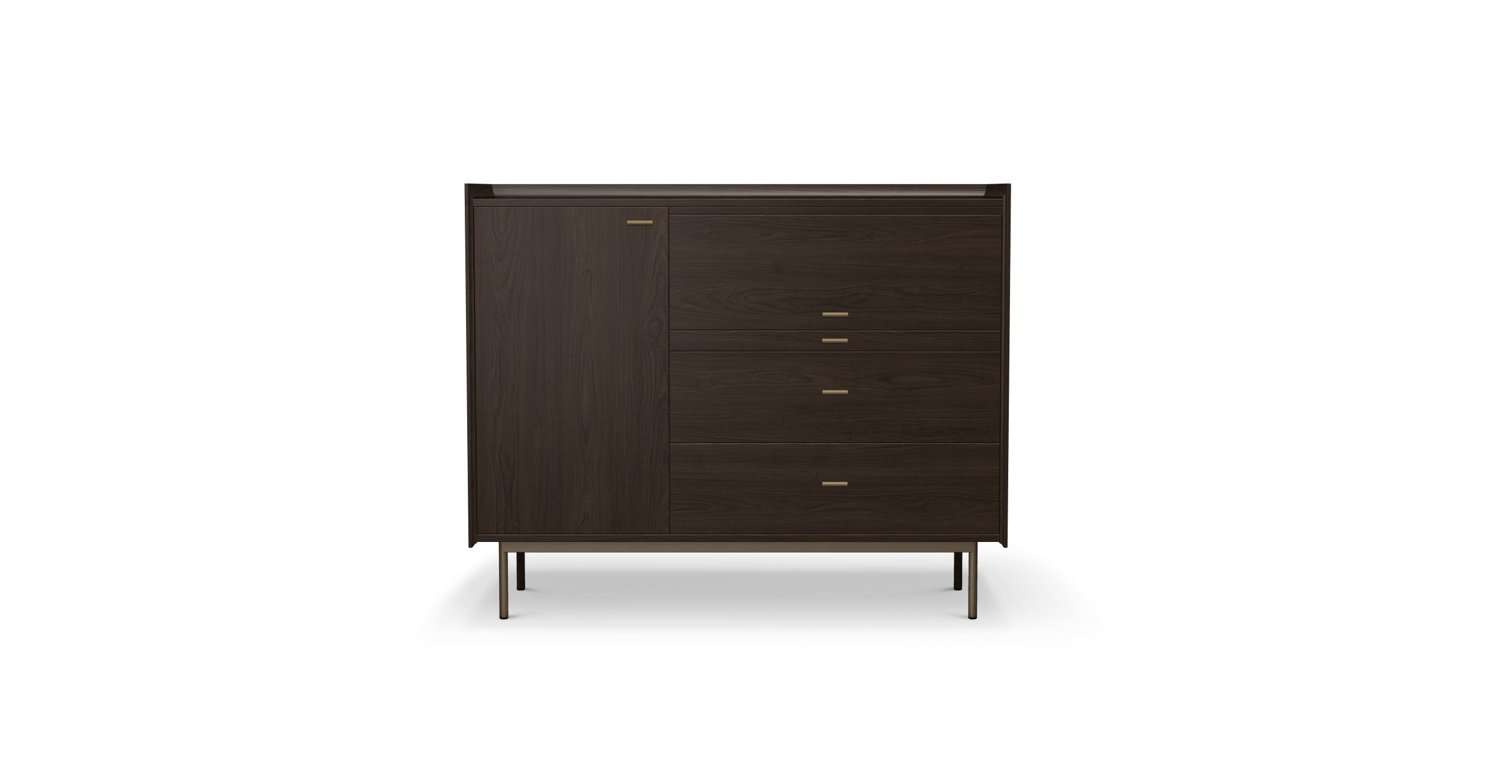 The Serra Collection in solid Black American Walnut has two bed styles- open wood platform or platform with storage. Headboards can be wood panel or upholstered; the bedside chest has an undermounted night light and all drawer pieces can be optionally fronted with mist or slate lacquered accents. Dove tail construction, soft close drawers and coin tray are standard. Lots of options here for personalization with stain, lacquer options, fabrics and a la carte ordering.