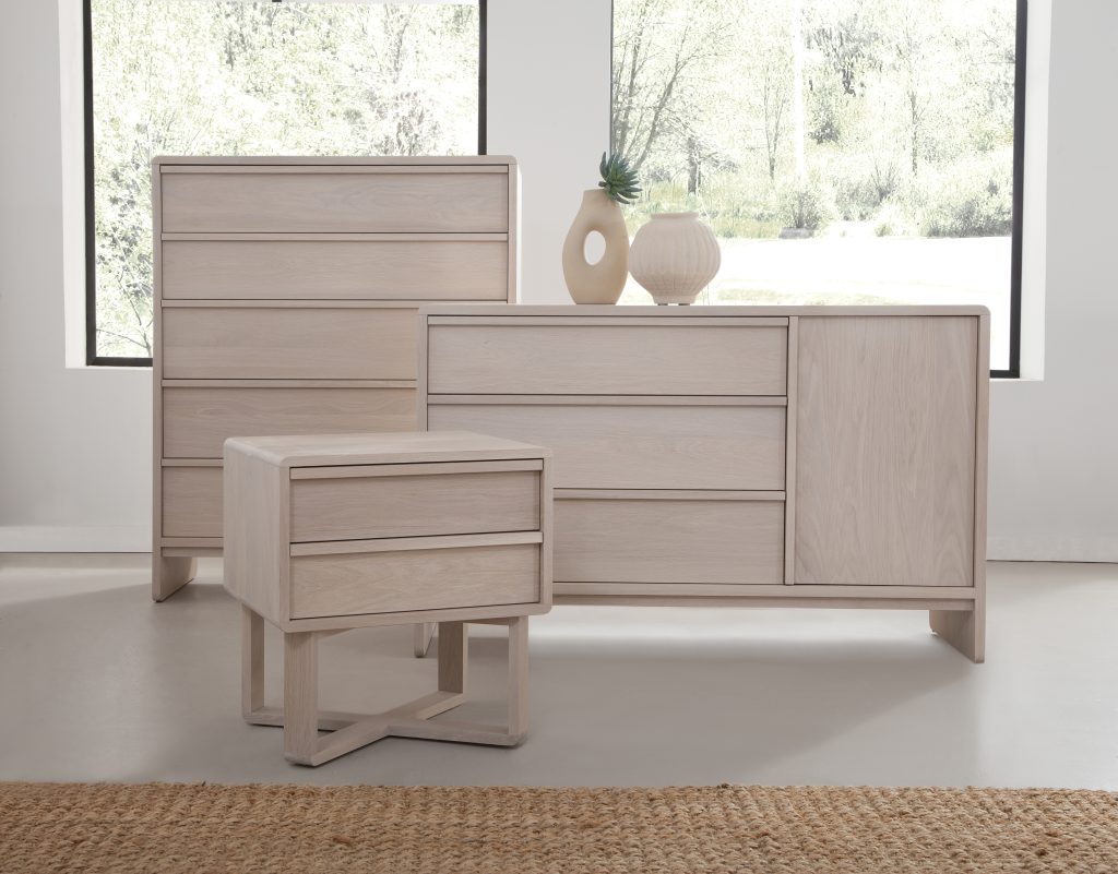 The Strada Collection combines solid white oak construction with hand hewn brass hardware and base supports. Strada offers choice of open or closed nightstands, long or media cabinet dresser, wood panel or upholstered headboards for King or Queen platform beds. Mirrors and an upholstered top storage bench complete the offering and again provide an opportunity to take these beautiful pieces out of the bedroom for wider use.