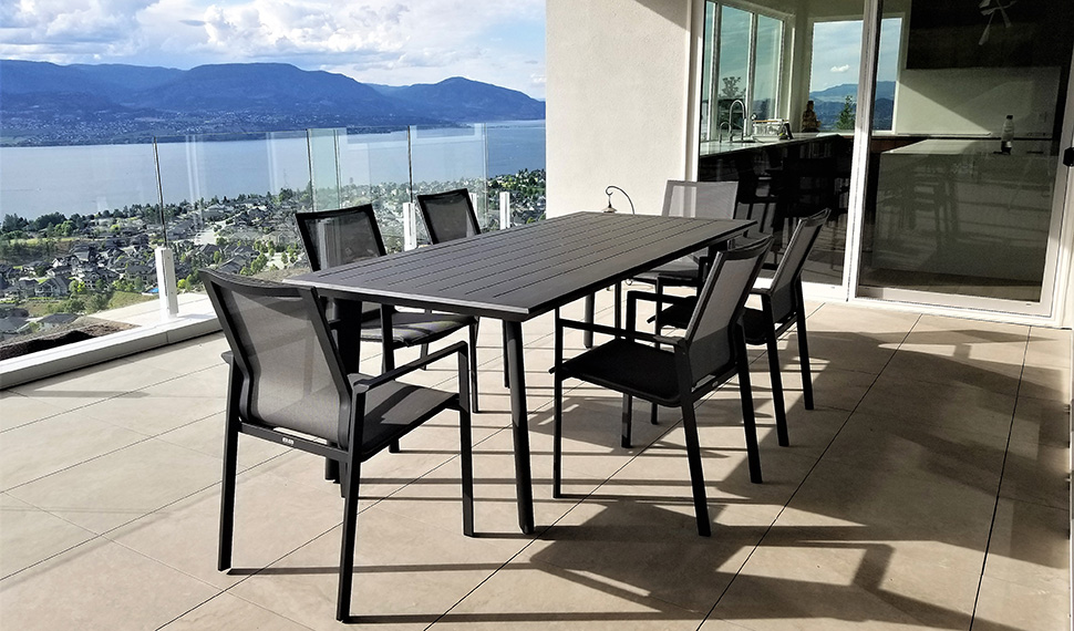 Rio Small 34×55, extends to 83″ with 4x Pringle stacking chairs in black – now $2750 for 5 piece set