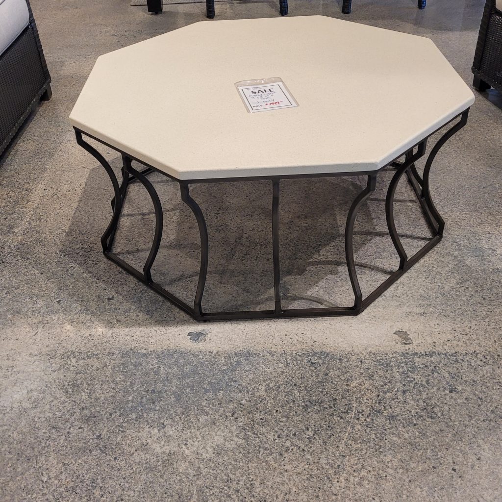 Audrey outdoor cocktail table with powder coated aluminum base and durastone top