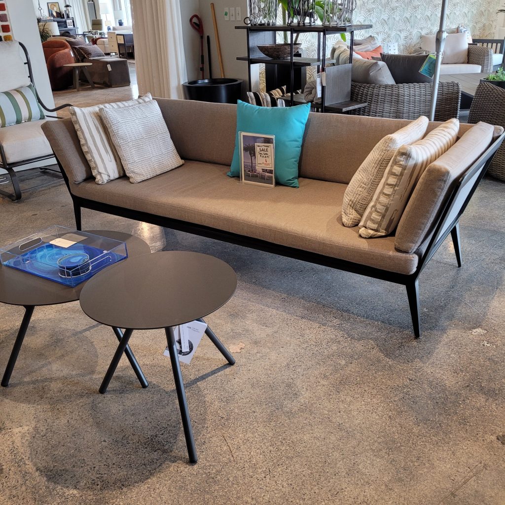 2 seat sofas and lounge chairs are stocked with taupe aluminum frames and desert cushions