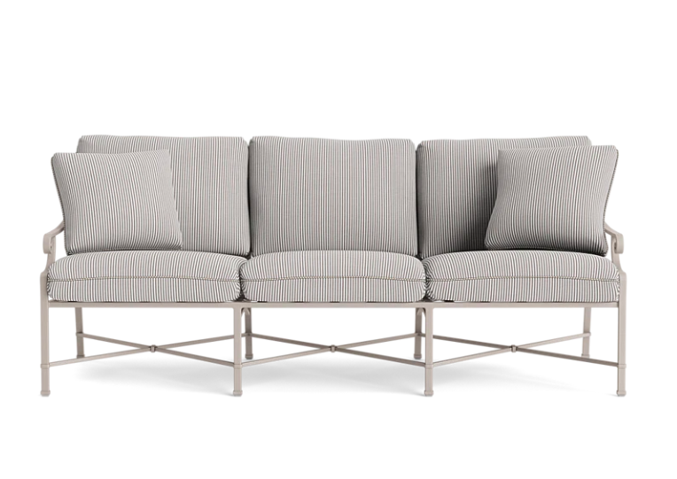 Venetian Sofa in Dune frame with ticking striped Sunbrella cushioning. Petite and perfect.